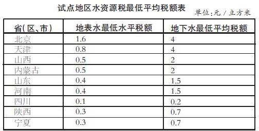 此次試點最低平均稅額為:地表水每立方米0.1-1.6元、地下水每立方米0.2-4元。按不同取用水性質實行差別稅額:對地下水超采地區取用地下水加征1-4倍;對超計劃或超定額用水加征1-3倍;對特種行業從高征稅;對超過規定限額的農業生產取用水、農村生活集中式飲水工程取用水等從低征稅。試點方案還明確了規定限額內的農業生產取用水、取用污水處理再生水、采油排水分離凈化后回注等6種減免稅情形。